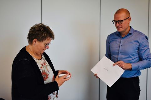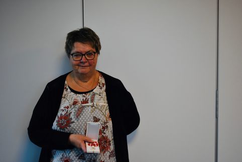 ..har været en tro medarbejder gennem hele 43år. Som tidligere annonceret her på hjemmesiden er hun her i dette efterår gået på pension. Vi har benyttet lejligheden til at indstille hende til Den Kongelige Belønningsmedalje, som hun i dag har modtaget fra vores adm. direktør, Hans Jørgen Hansen.